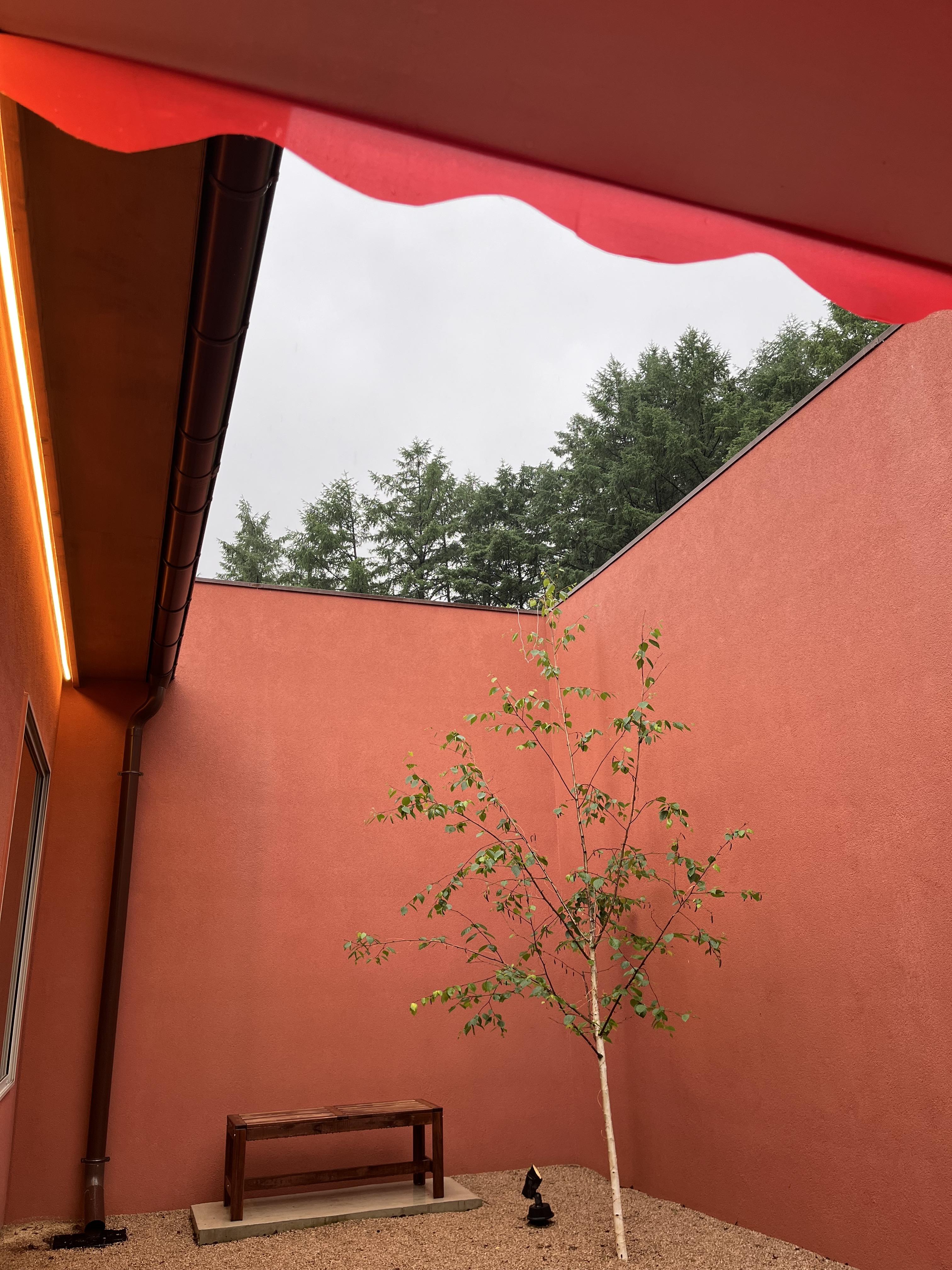 일월일지는 각 객실마다 옛날 주택의 ‘대문’처럼 보안문이 설치되어 프라이빗하면서도, 숙소 내에 있는 작은 뜰의 천장이 뻥 뚤려있어 객실 어느 공간에 있든 하늘과 바로 맞닿아있는 듯한 자유로움을 느낄 수 있다. 우리가 방문했던 5월 초여름의 일월일지는 이 오묘한 붉은빛의 담장을 너머 펼쳐진 초록빛들의 향연이었다.