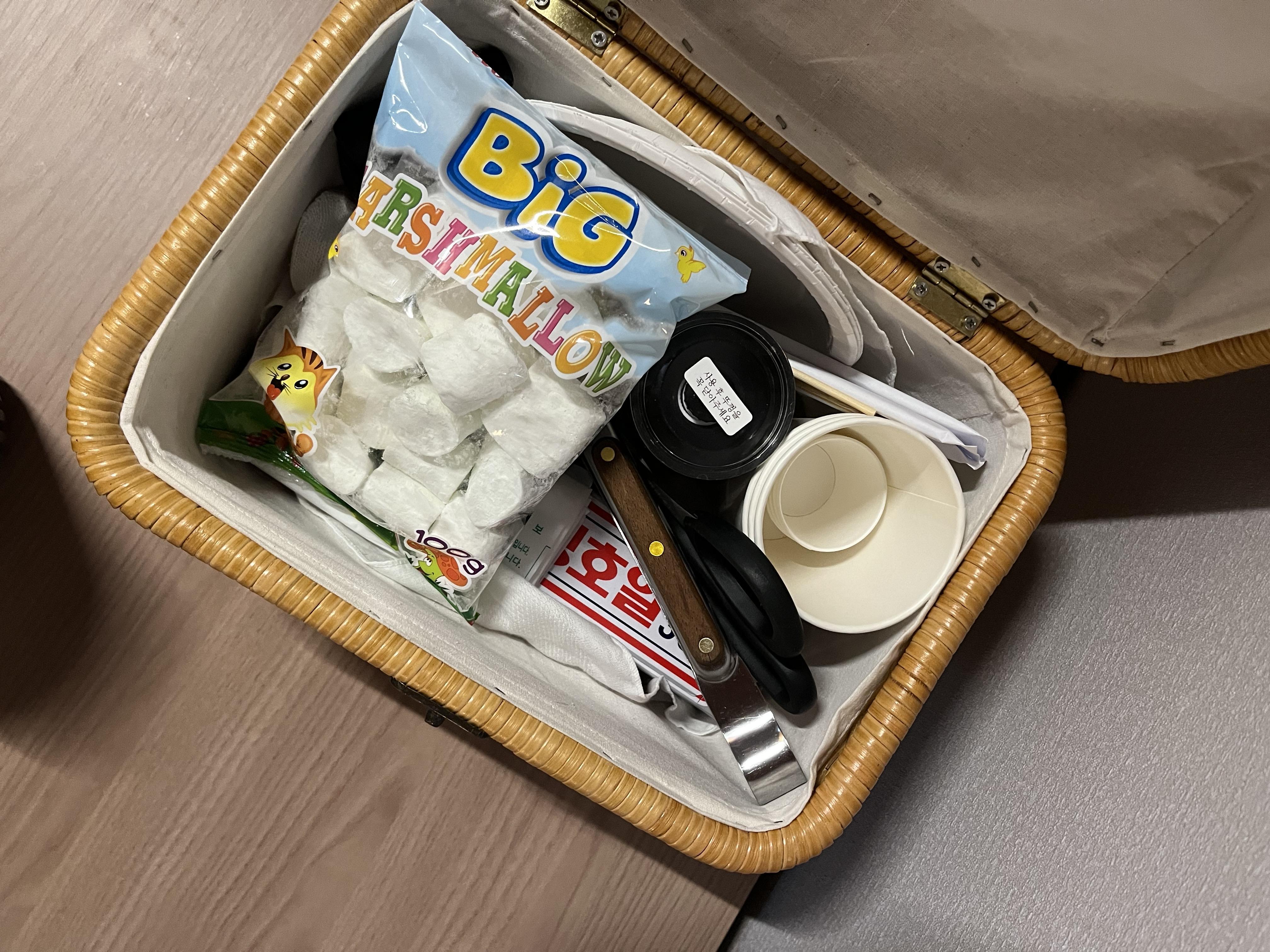 우리는 바베큐에 꼭 필요한 삼겹살, 김치, 햇반정도만 챙겨가는 편인데 이번에도 집에서 소금을 챙기지 않아 근처 편의점을 다녀와야 하나... 하던 찰나, 소금은 물론 마시멜로우까지 담겨있는 웰컴바구니를 발견했다. 이 순간 내 마음은 이미 다 녹았던 것 같다.