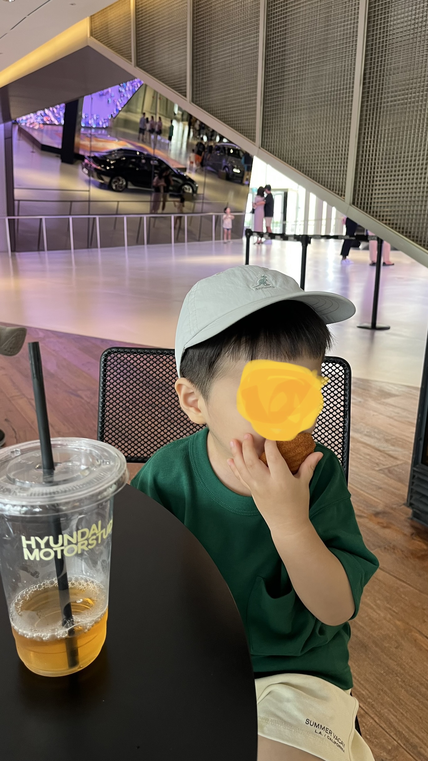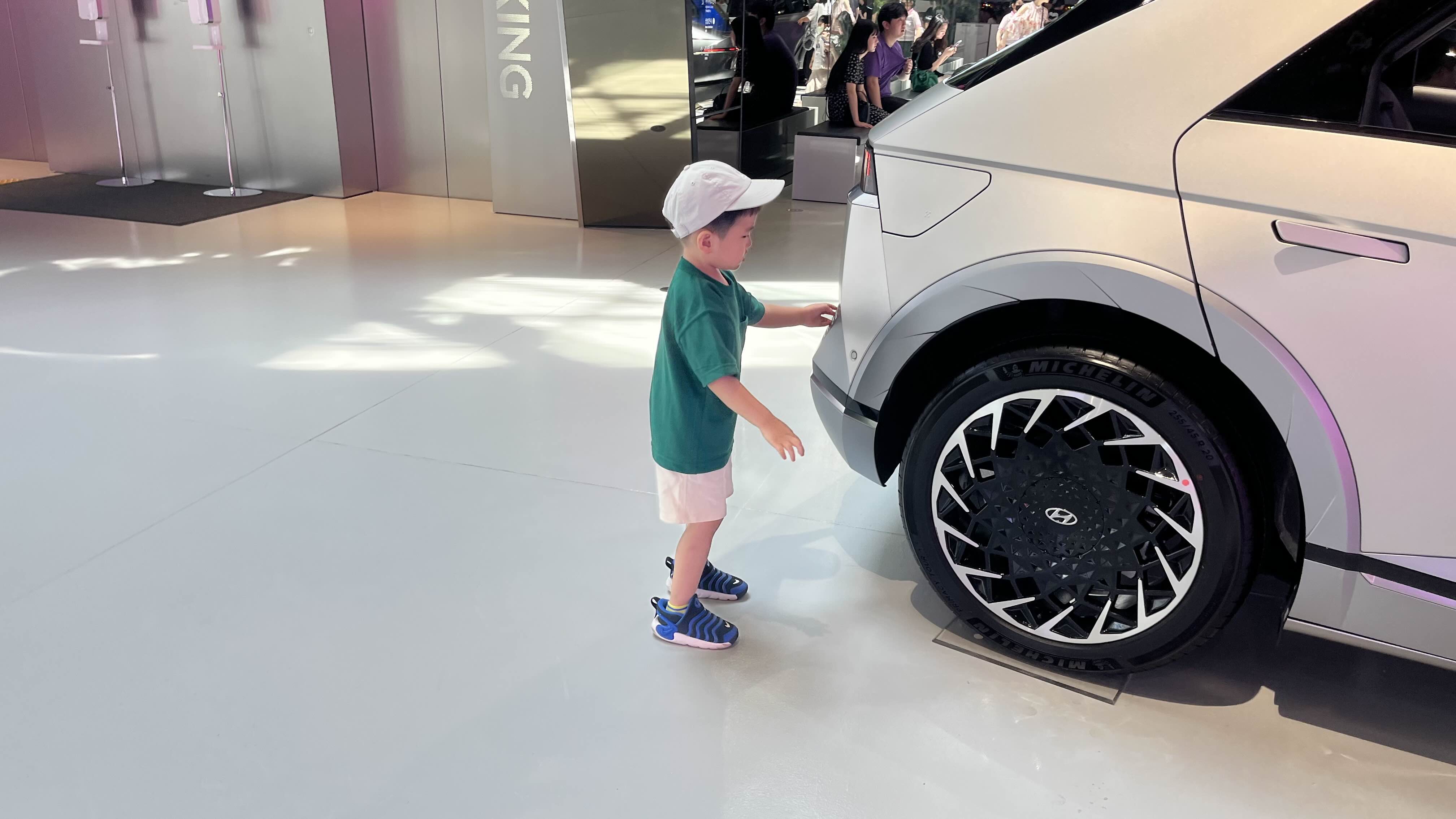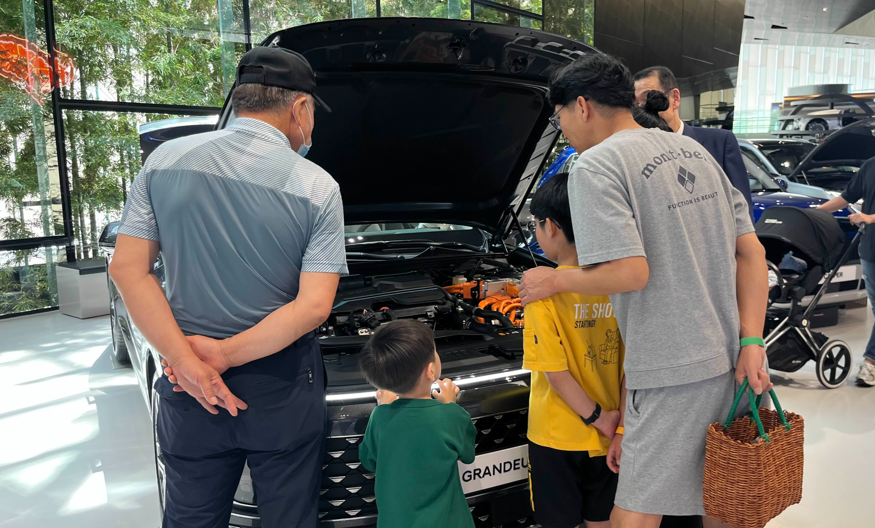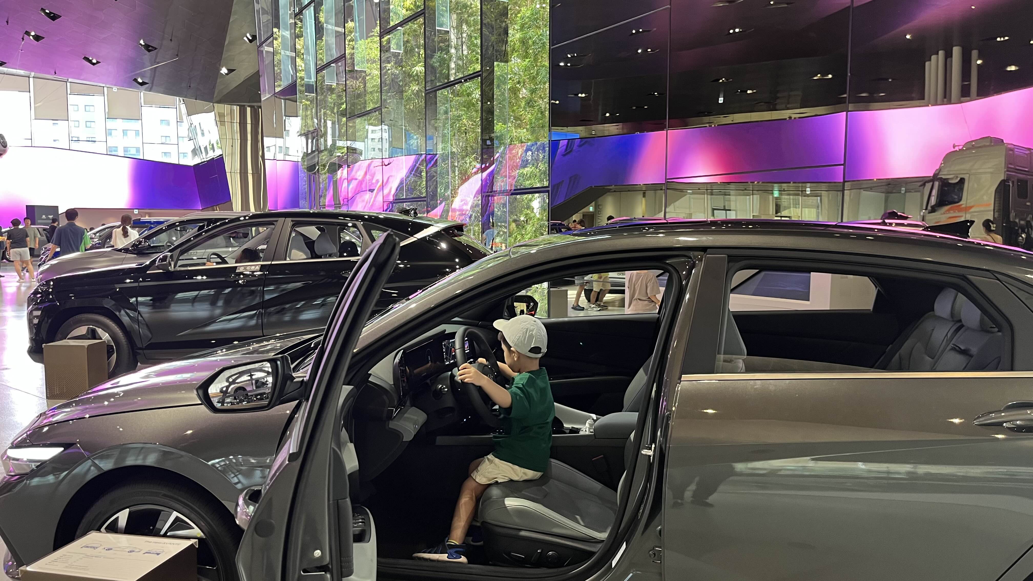 메인 로비로 올라오면, 엘리베이터 문이 열리자마자 탁 트인 스튜디오의 공간감에 압도된다. 세련된 미술관에 온 듯한 느낌이다. 넓은 스튜디오엔 현대의 고급스러운 신차들이 줄지어 서있고, 깔끔한 복장과 밝은 미소를 띈 직원들이 친절하게 안내해 주시는데 약간 애플 스토어에 들어섰을 때 느껴지는 감흥과 비슷했다. 개인적으로 좋았던 점은 나이가 지긋이 든 어르신들도 안내를 도와주고 계셨는데, 예상컨대 현대자동차 계열에서 퇴직 후 시니어 봉사활동 혹은 소소한 알바가 아닐까 싶었다. 한 초등학생 아이가 자동차 엔진에 관심을 보이자, 시니어 안내원께서 휘발유차의 본넷과 전기차 본넷을 열어가며 정성껏 설명해 주셨다. 그 바람에 옆에 있던 우리도 전기차 본넷은 엔진이 없고 텅텅 비어있다는 사실을 처음 알았다. 신기했다.